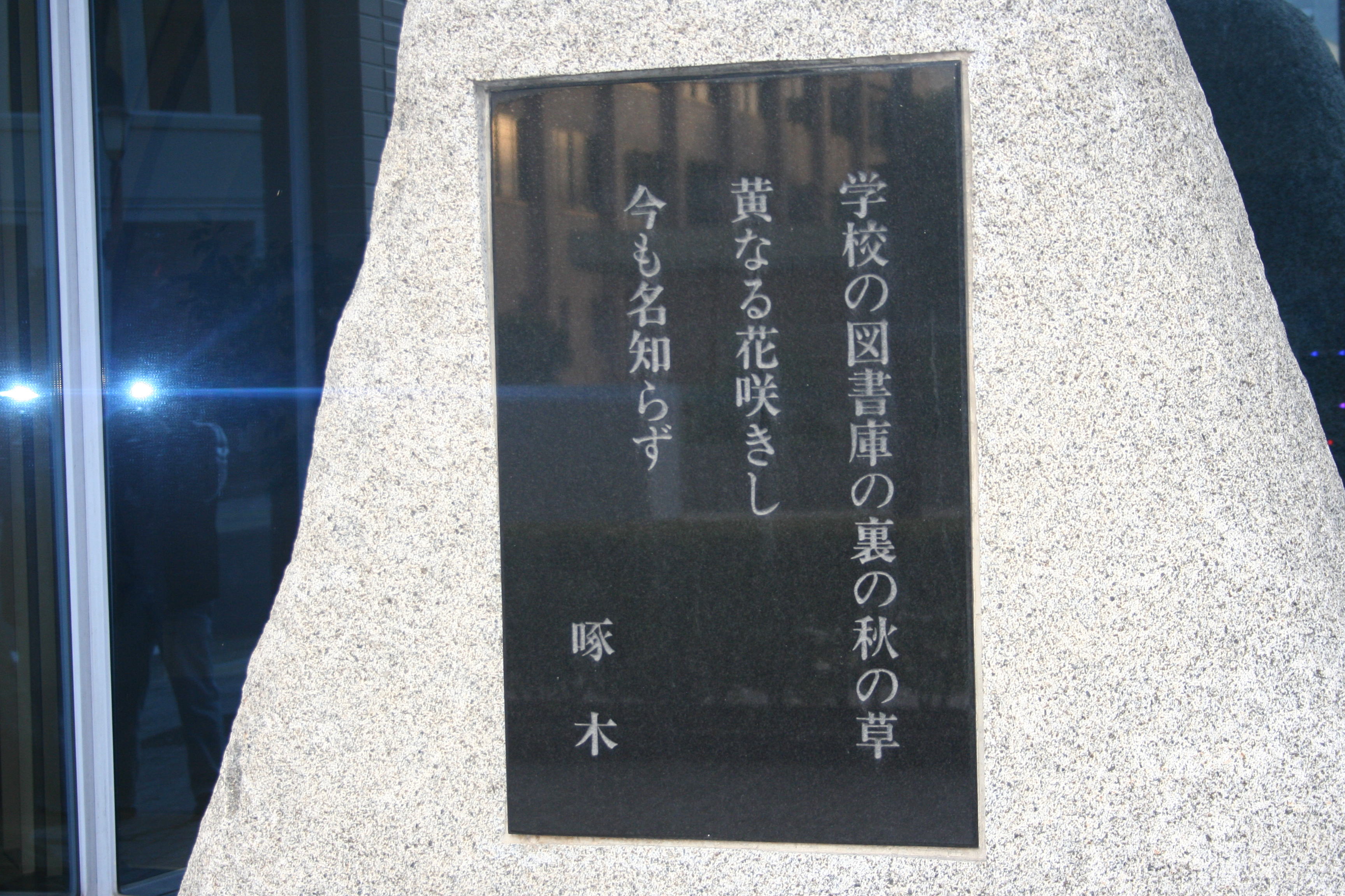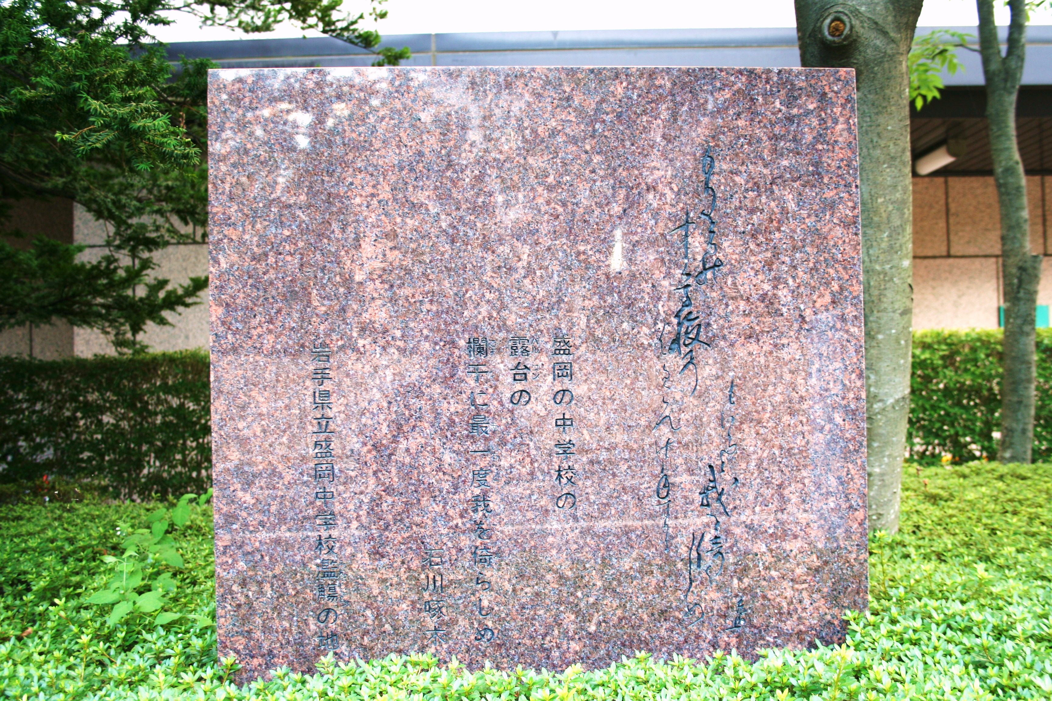 啄木は明治31年岩手県盛岡中学校(現在の盛岡第一高等学校)に入学、明治35年の退学までの間学んでおります。当時の盛岡中学校は、現在の岩手銀行本店の場所にあり、銀行と裁判所の間の道路に沿った銀行の敷地内に「盛岡中学濫觴の地」と銘のある歌碑があります。この歌碑は昭和58年11月に建てられております。