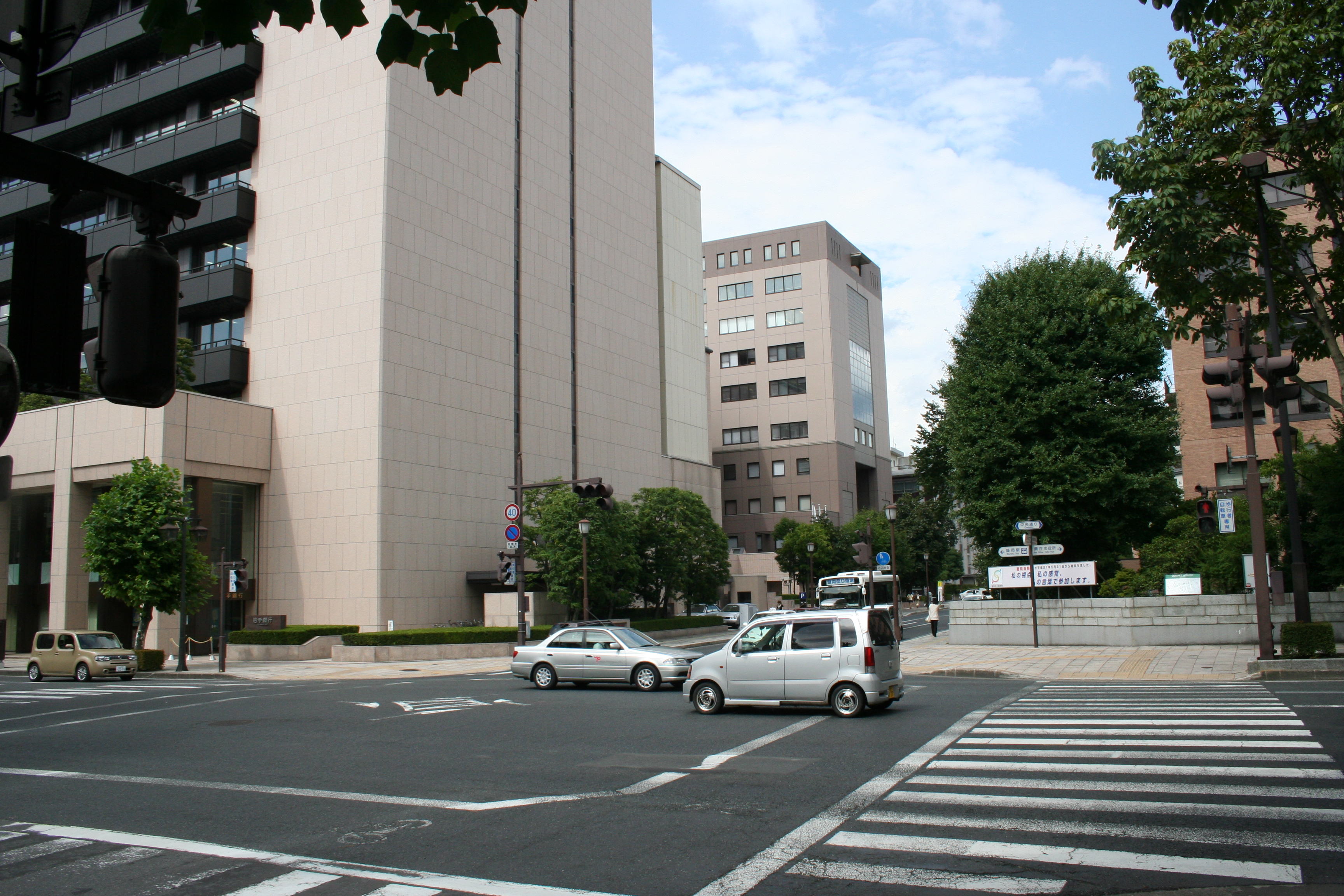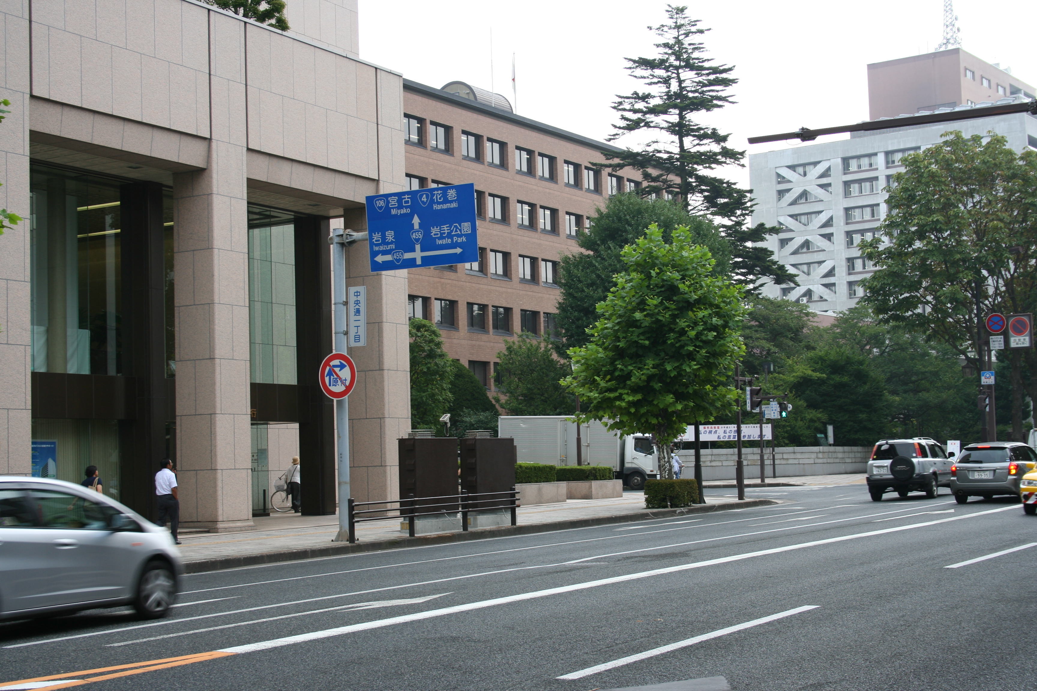左から岩手銀行本店、道路を挟んで裁判所、岩手県庁
