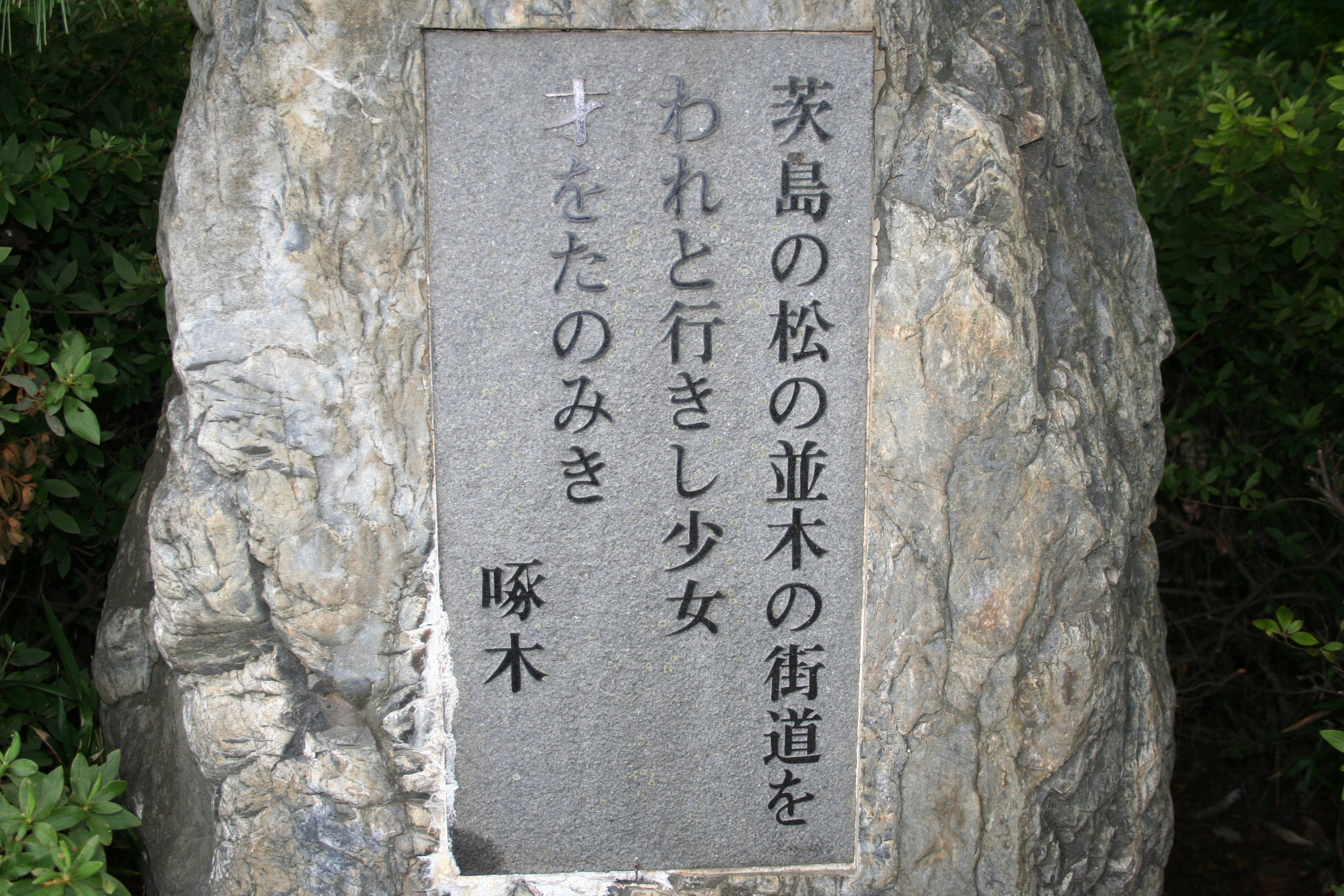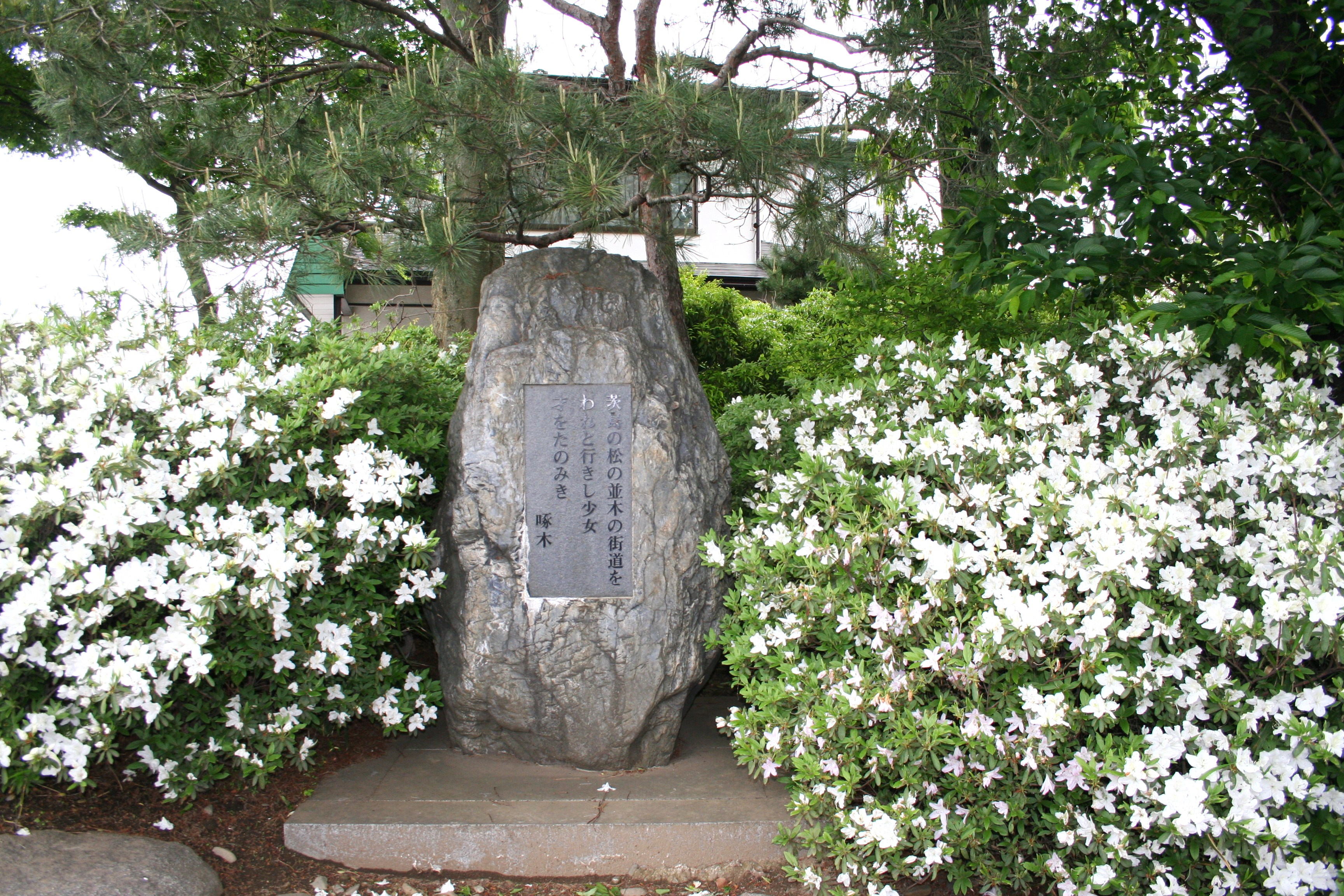 この歌碑は、昭和30年10月、啄木生誕70年を記念して盛岡啄木会の協力で建てられたものである。かつては、ここから岩手山を遠望することができ、盛岡市内も見おろせる風光の地であった。歌碑の文字は、啄木の恩友金田一京助博士の書である。(案内板)